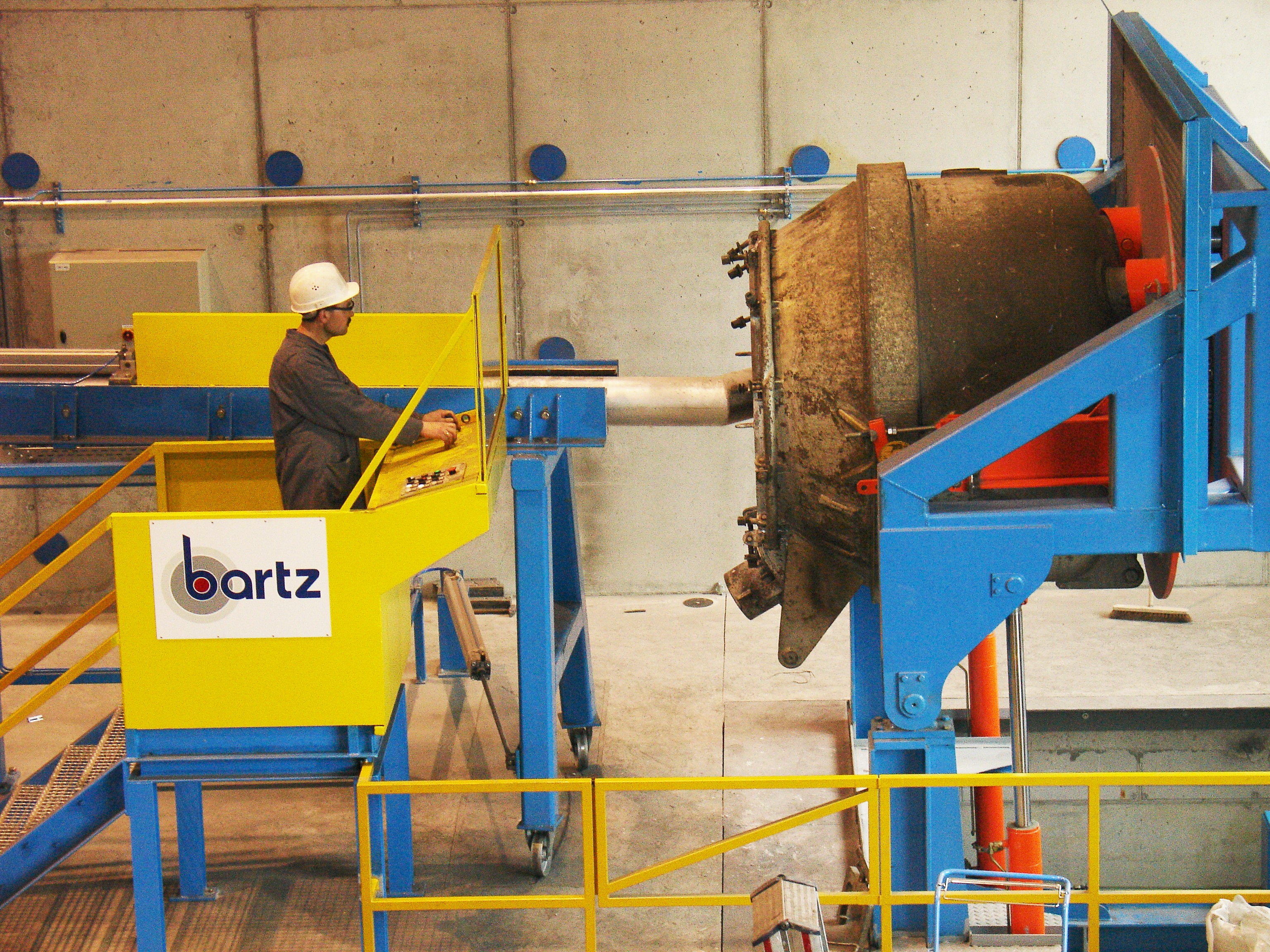 The hot-cleaning machine is used forfast cleaning of empty and hot transport crucibles for liquid aluminium between the charging cycles. A pneumaticallyoperated chisel is used to remove deposits from the refractory lining thus reducing transportcosts. The transport crucible is ready to be used again immediately after cleaning and re-heating.